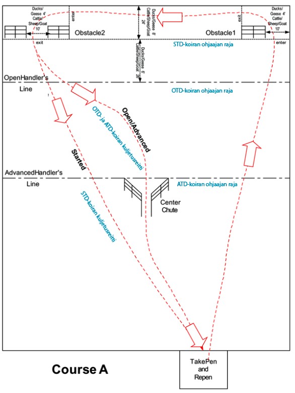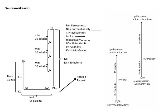 - "Vapaana seuraaminen; seuraamiskaavio vaihtelee kokeittain, tuomari suunnittelee sen erikseen joka kokeeseen. Seuraaminen sisältää käännöksiä ja pysähdyksiä. Seuraamiskäskyn saa antaa vain kerran liikkeen alussa.Kaavio näytetään ohjaajille kokeen alussa nollakoiralla.