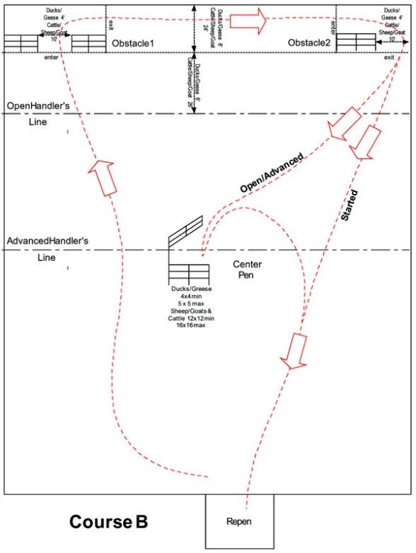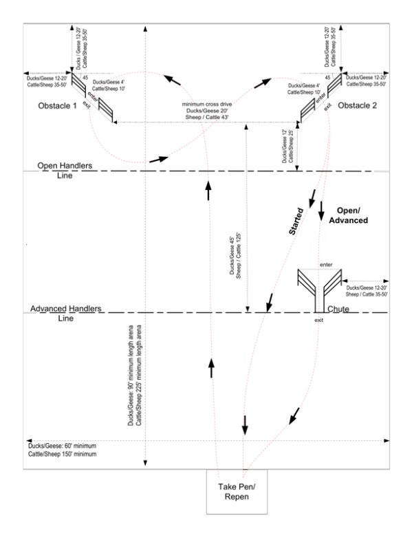 - Avoin luokka; Avoimen luokan kulku on samanlainen alokasluokan kulun kanssa, siihen saakka kun varsinainen ohjaaja vastaanottaa koiran tarkistuasemalla C. Kun varsinainen ohjaaja on vastaanottanut koiran tarkistuasemalla C, koira lähetetään kolmannelle viestiosuudelle, joka kulkee tarkistuasemalta C takaisin tarkistuasemalle A. Koiran apuohjaaja vastaanottaa koiran tarkistuasemalla A, jonka jälkeen avoimen luokan viestiosuus päättyy. Koiran kokonaisviestimatka on 3600m (B->A 1000m, A->B 1000m, B->C 300m, C->A 1300m) ja koiran suoritusaika on 22 minuuttia.