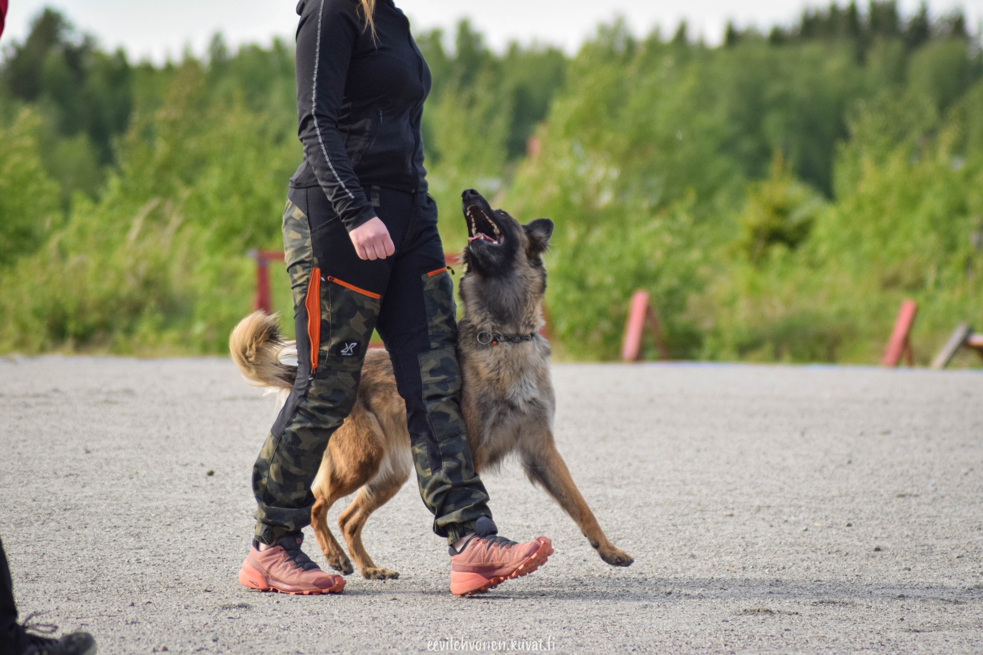 - "Hyökkäysliikkeissä (keppihyökkäys, välinehyökkäys, pako) koira lähtee vasta käskyn saatuaan kohti maalimiestä ja pyrkii puremaan heti. Irrotus tapahtuu tuomarin merkistä joko pillillä viheltämällä tai ohjaajan suullisella kutsulla.