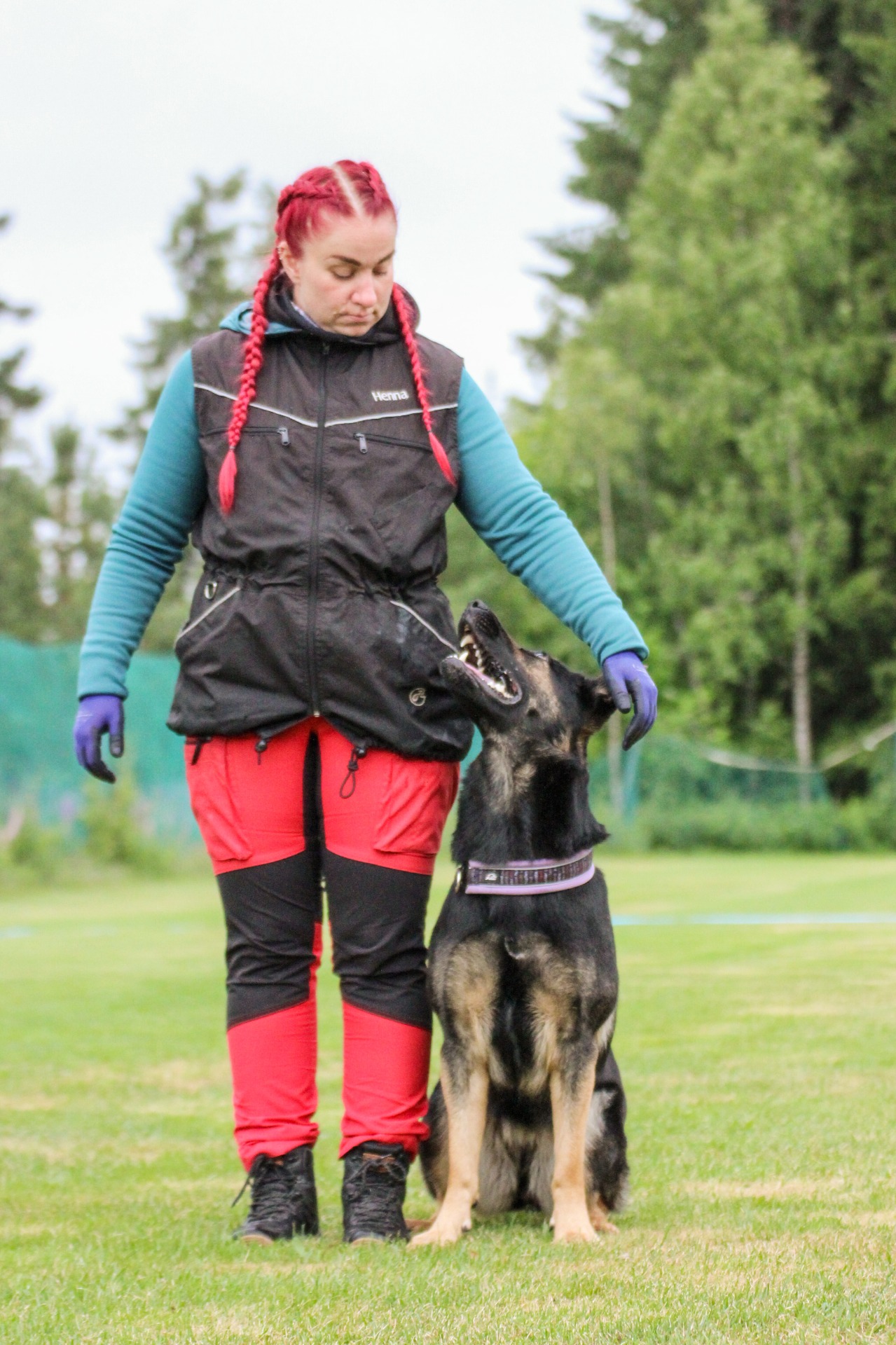 - Ohjaajan puolustus; liikkeen kaavio näytetään ohjaajille nollakoiran toimesta. Ohjaaja antaa liikkeen alussa koiralle puolustuskäskyn, jonka jälkeen ohjaaja ei saa puhua. Yksi tai kaksi maalimiestä aiheuttaa koiralle häiriötä kokeeseen tehdyn skenaarion mukaisesti. Koirakko voi joutua liikkumaan eri tavoin, istumaan, työntämään tai heittämään esineitä jne. Koiran on pysyttävä metrin sisällä ohjaajastaan ja purtava vasta hyökkäyshetkellä. Hyökkäys tapahtuu läimäyttämällä ohjaajaa kahdella kädellä. Liikkeeseen sisältyy aina ohjaajan kättely, jolloin koira ei saa purra. Irrotuksen jälkeen koira jää vartioimaan maalimiestä ja palaa ohjaajansa luo vasta kutsusta, johon tuomari antaa luvan. Skenaariot vaikeutuvat luokittain.